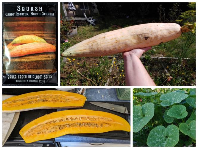 ‘Candy Roaster, North Georgia’ winter squash — Upside? These squash are HUGE. They're each about the size of one of my ARMS. The flavor was really nice when I baked one up. A little sweet, and the flesh was silkier and smoother than most home-grown squash I've cooked. The downside? These squash are HUGE. All two of them. One big sprawly 8'x8' vine patch made exactly two behemoth squashes. I had to maneuver them around because they wanted to grow in the path and over a wooden board that would have grown a funny ridge into one squash. Be sure you're prepared to heavily train this one up an arbor, or give it lots of space to spread and root in to make tasty sweet long bois.