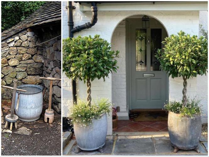 In June of last summer, B&B proprietor and Gardener Jenny Williams turned an old cattle feeder into a planter to spectacular effect. The long trough was elevated on breeze blocks, holes were drilled for drainage and a dense combination of dahlias, salvias, and other plants made up the summer display. In the fall, Jenny planted tulip bulbs and erysimum in the trough and filled antique dolly tubs with more bulbs. These once pedestrian zinc wash tubs are widely available online from ebay, Chairish, antique and home decor stores and are given a second life in some of the most exquisite gardens. Elliott of Elliott’s Organic Garden Diary has two such planters flanking the front door of his home. He has planted them with braided bay tree topiaries and frothy Erigeron karvinskianus.