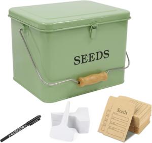 There aren’t many seed storage boxes tall enough to fit the larger seed packets like the ones from Baker Creek, but this one has the necessary height and comes with accessories like seed packets to store and share your own seed harvests.