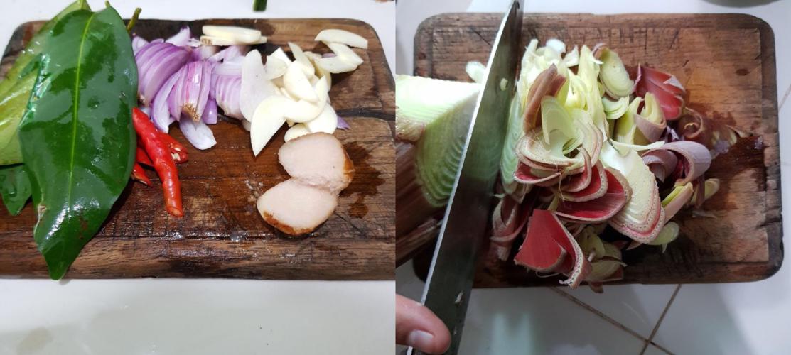 - Saute garlic in olive or coconut oil until aromatic, add shallot and saute several minutes until lightly browned. Add galanga, chili peppers and bay leaves, cook until bay leaves change color from dark green to dark brown.