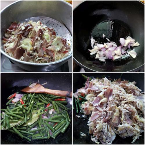 - If using long beans, add them now with 1 cup of water. Cook for about 5 minutes until most of the water has cooked off and beans are cooked. Add more water if necessary.