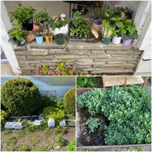 I moved my hardening-off plants out to the front porch so they can get used to outside again. So far, they are doing well. Winter sown seeds are growing. Mom requested that I dig out all the sedums left from the previous owner because she wants them to move to where she will have ornamental grass. Yesterday, I gave my neighbor two tomato plants that I grew from seeds and she showed me the room she uses to grow seeds and her greenhouse full of seedlings that she’s growing, along with the two zinnias I gave her that are thriving.