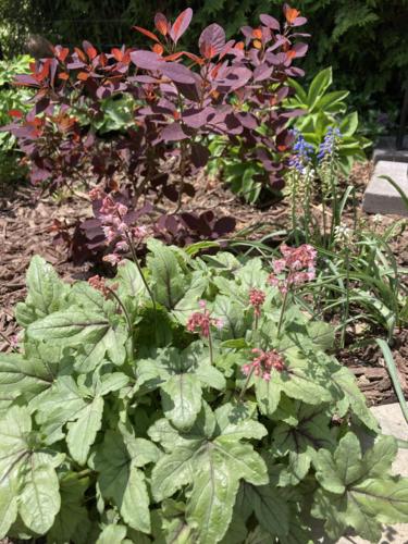 ‘Pink Fizz’ heucherella with ‘Royal Purple’ smoke bush (Cotinus coggygria), and some fading muscari.